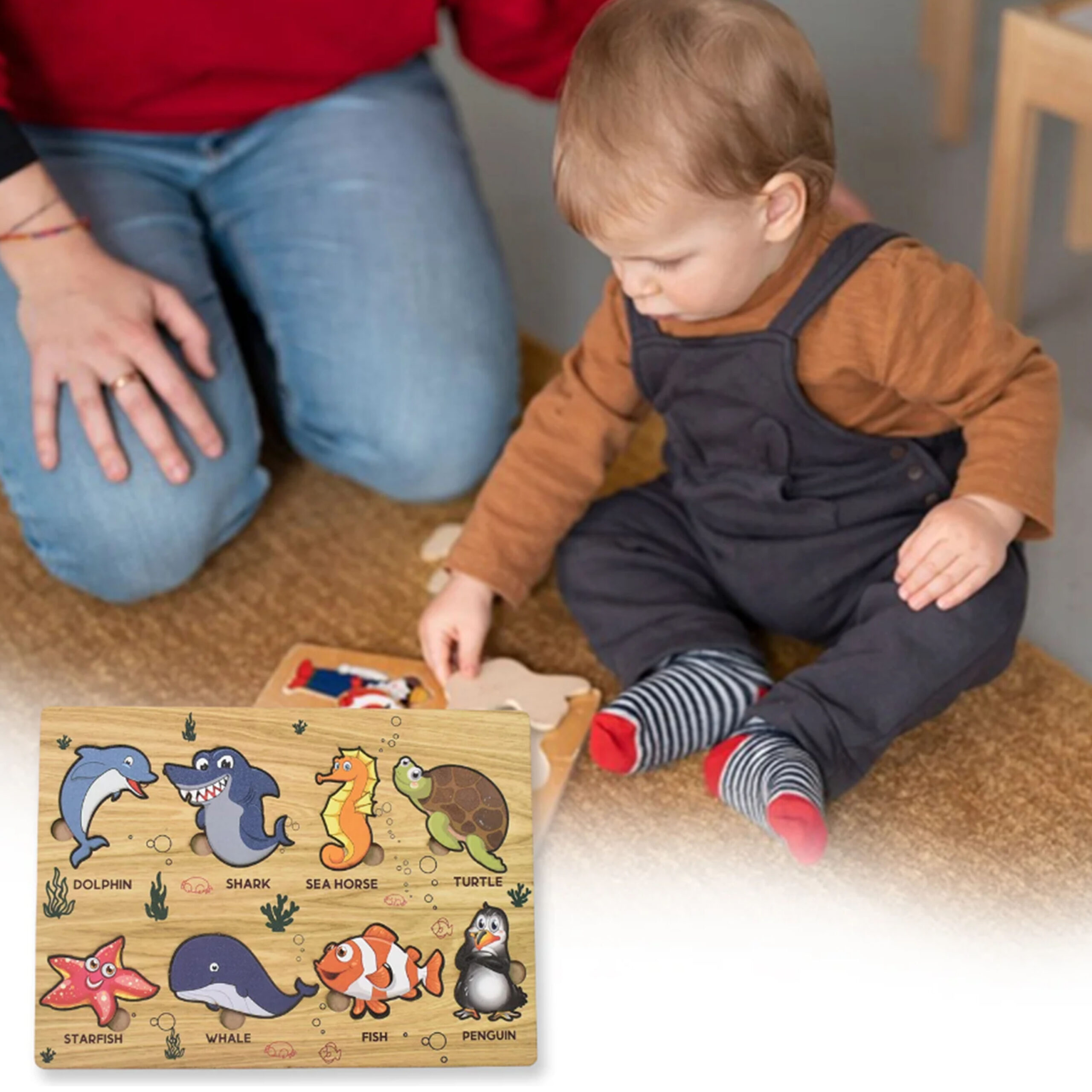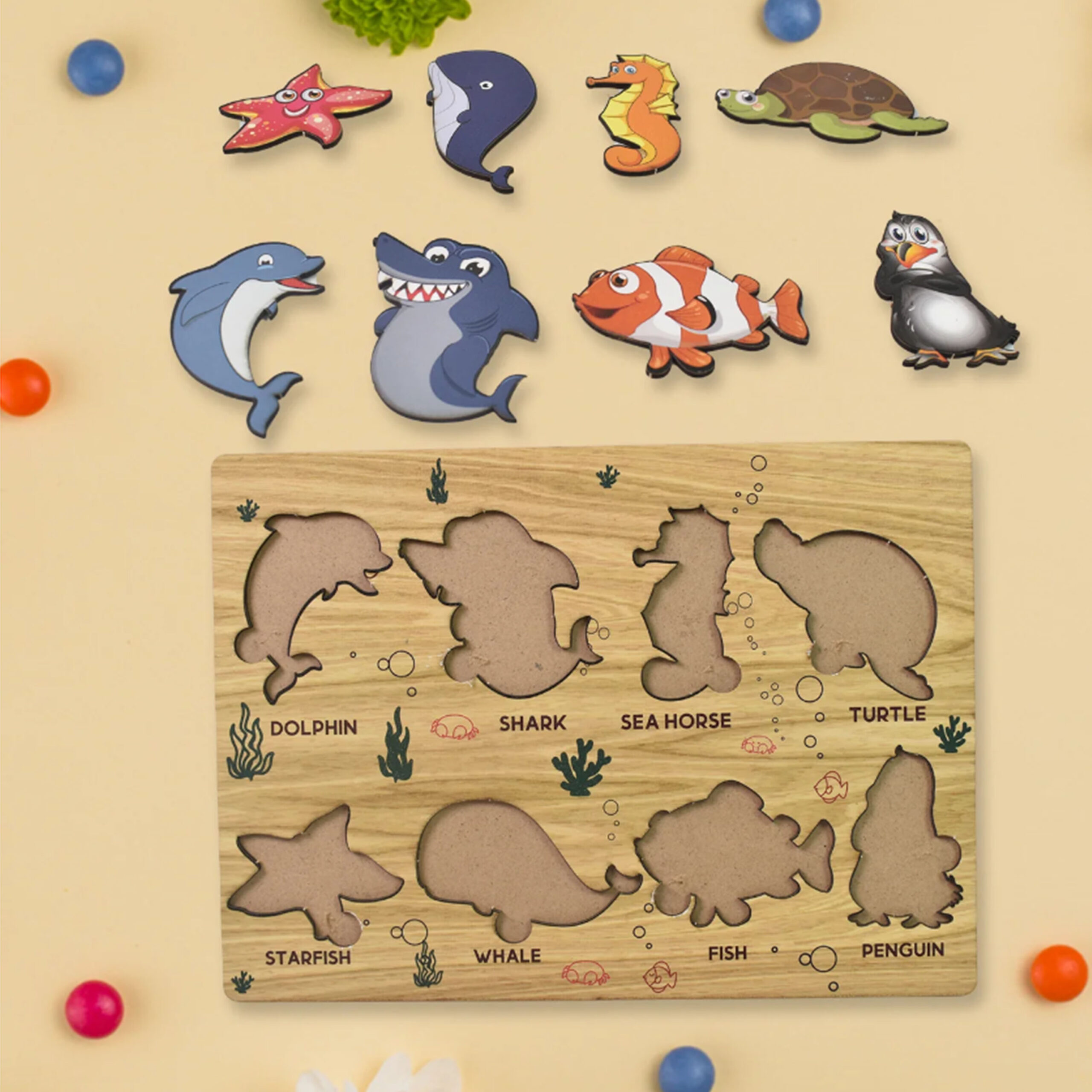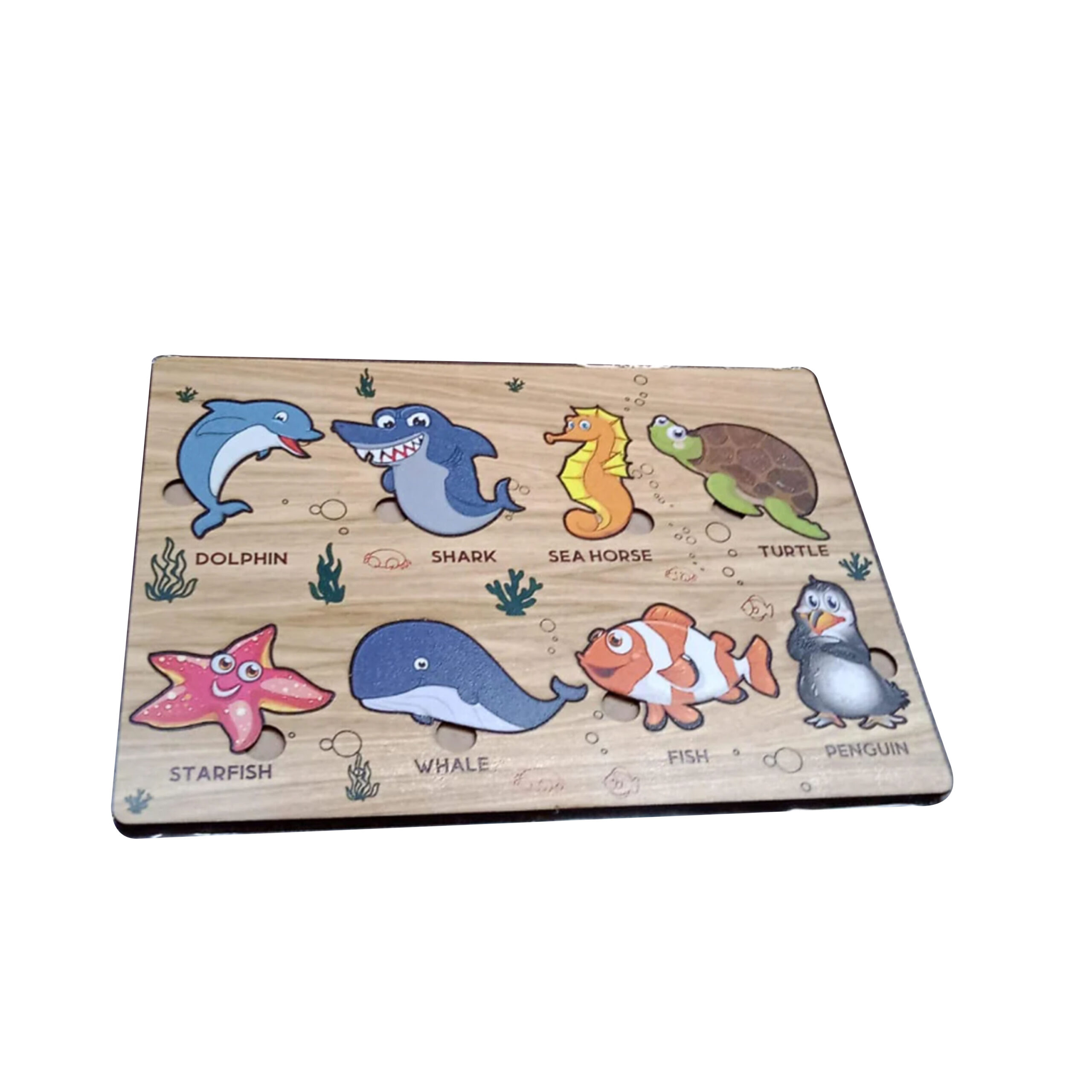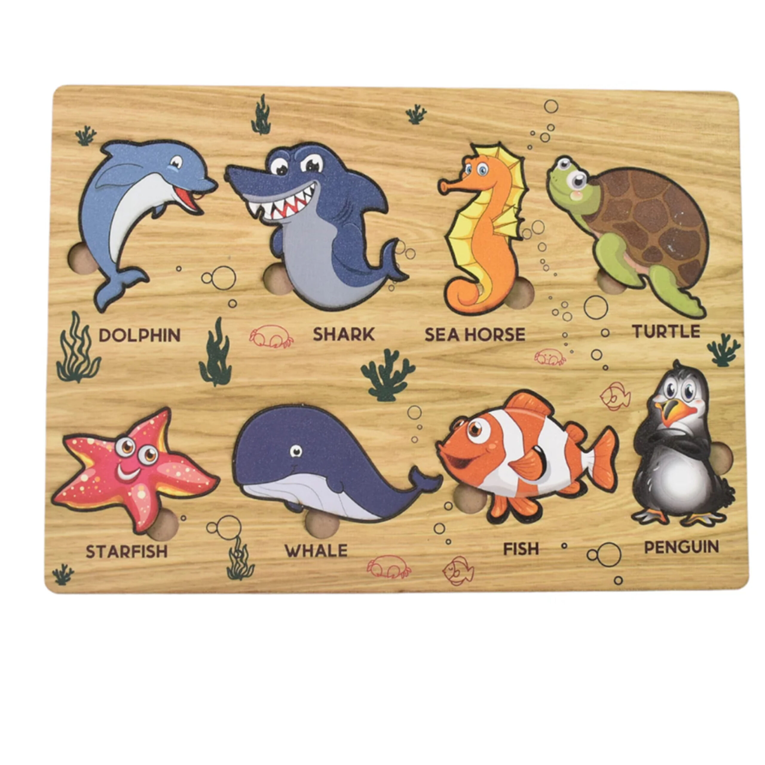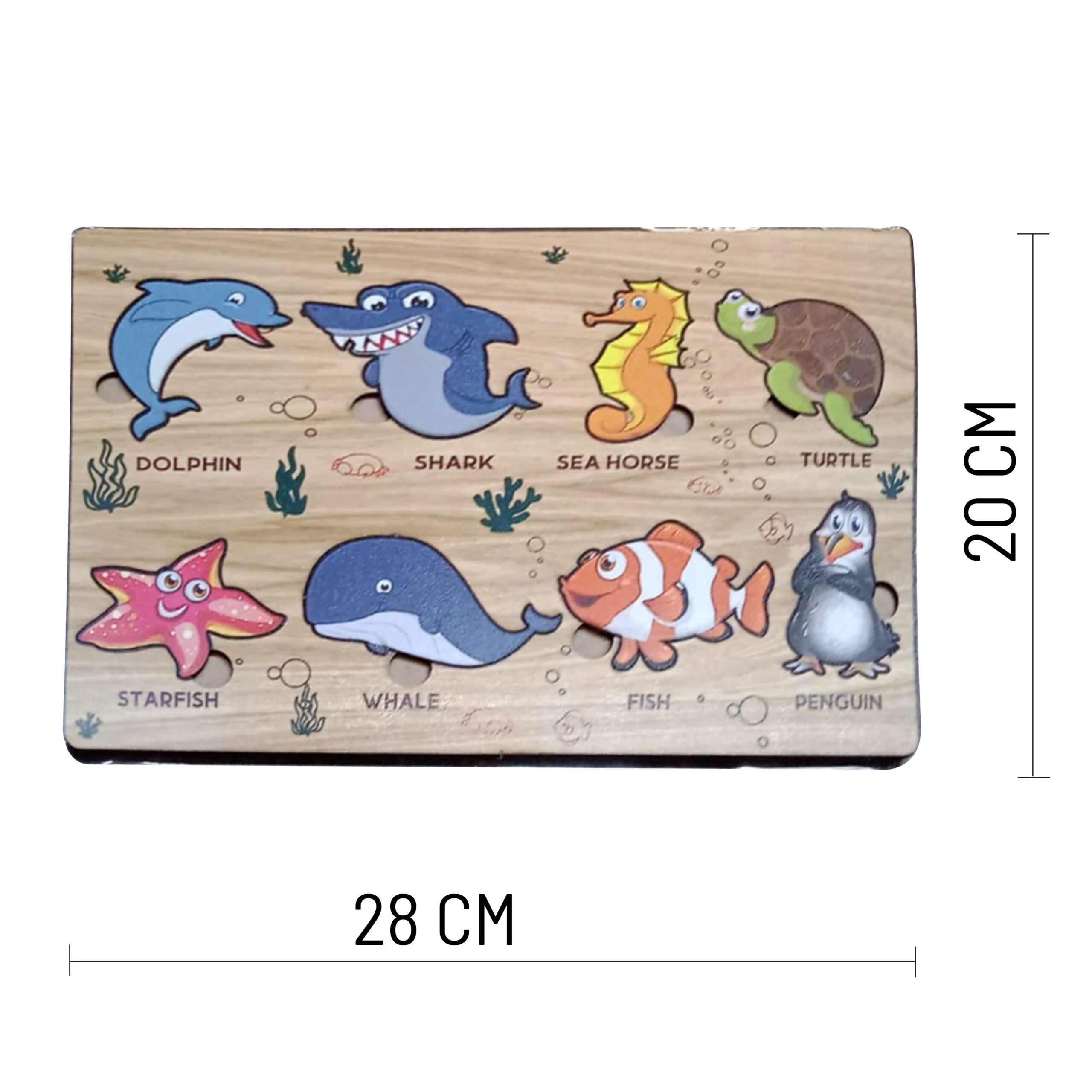 Introduce your little one to the wonders of the ocean with our engaging and educational Wooden Sea Animal Puzzle! Crafted from high-quality, durable wood, this vibrant puzzle features adorable and chunky pieces representing various beloved sea creatures. Designed with tiny hands in mind, each piece is easy to grasp, promoting fine motor skills, hand-eye coordination, and problem-solving abilities. Watch as your child delights in identifying and placing each animal, building their cognitive skills while exploring the fascinating world beneath the waves!