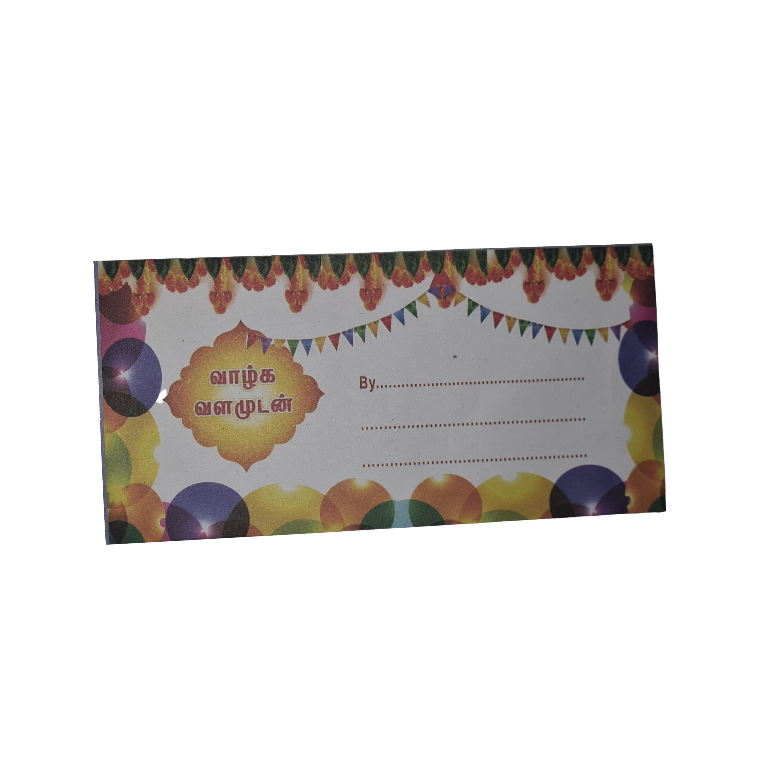 Celebrate every special moment with tradition and elegance! These thin paper gift envelopes are designed to suit all kinds of festivals – from Diwali to Pongal, Eid to Christmas, and even weddings or housewarming functions. Each envelope carries warm wishes beautifully printed in Tamil, adding a personal and cultural touch to your gifts.